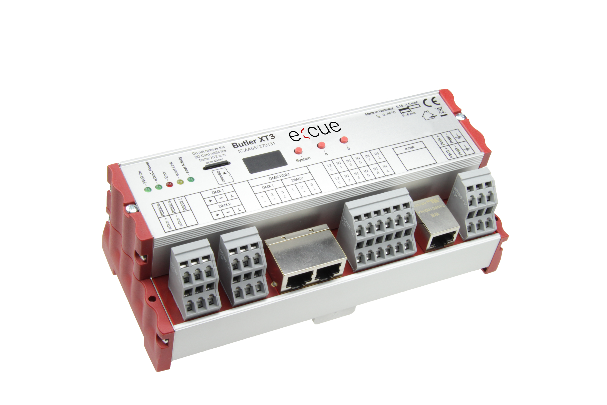 The Butler XT3 is a DMX/RDM engine which can be used in standalone mode to replay and loop lighting shows which have been previously uploaded and programmed using a PC running the e:cue LAS software suite. It can also be used as a DMX/RDM device, controlled by another e:cue engine. In standalone mode, the Butler XT3 can control up to 1,024 DMX/RDM channels. It is possible to increase the DMX/RDM channel count to 65,536 channels by clustering more Butler XT3s. The engine offers a variety of connectivity options for controlling the lighting show running on the device. These include direct connection to the Glass Touch GT12X, RS-232, digital inputs and Ethernet.