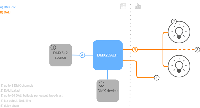 A flexible converter from DMX signal to DALI, DMX2DALI+ is a simple solution for controlling electrical DALI ballasts and dimmers using a DMX controller. DMX2DALI+’s flexibility makes installations easy by using auto and manual DMX addressing modes. Eight addressable consecutive DMX channels  control eight DALI outputs. Each output supports up to 64 DALI ballasts or dimmers (broadcast mode), while one DMX2DALI+ supports up to 512 electrical DALI ballasts and dimmers, typically used for control of fluorescent lighting.