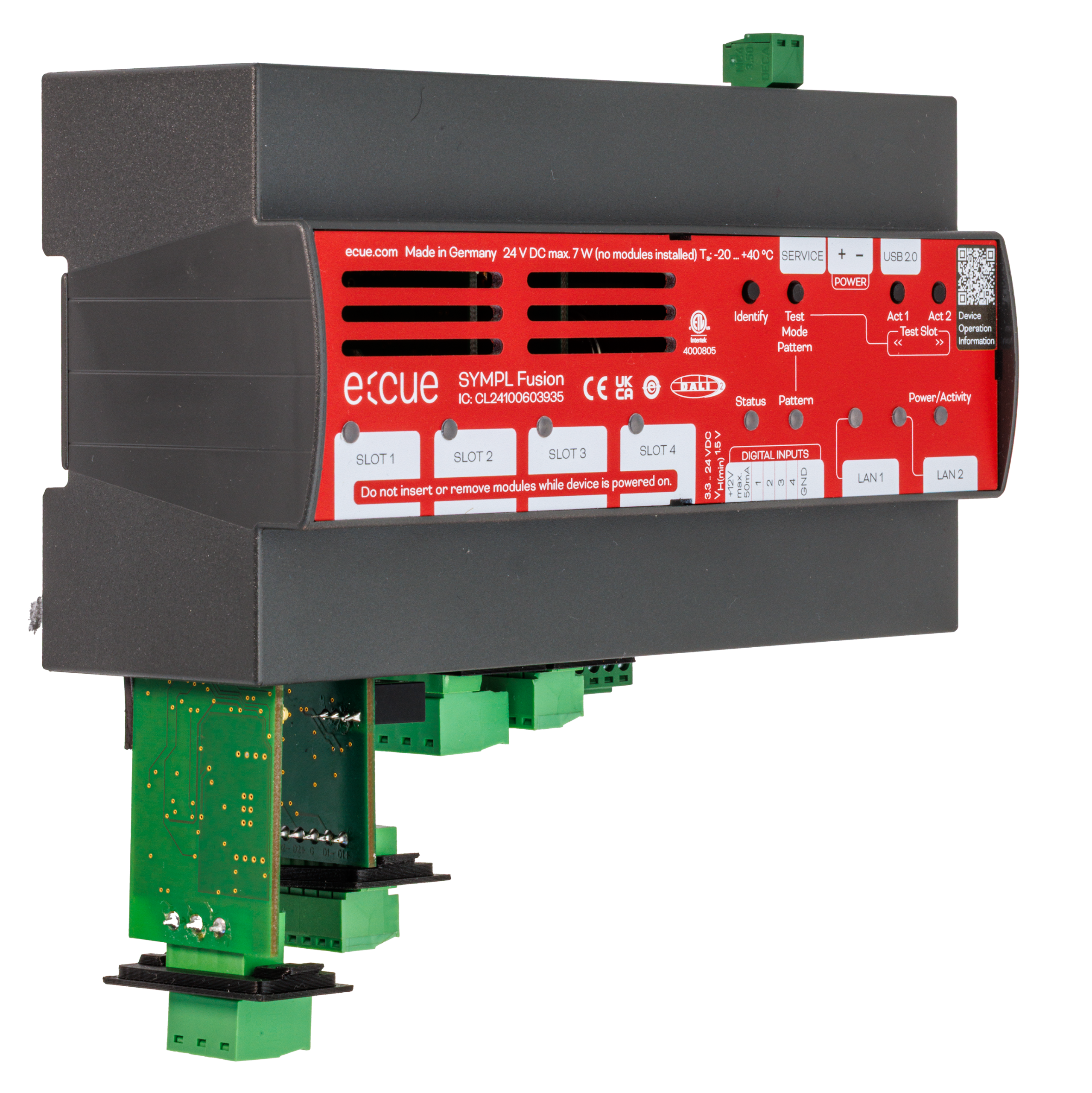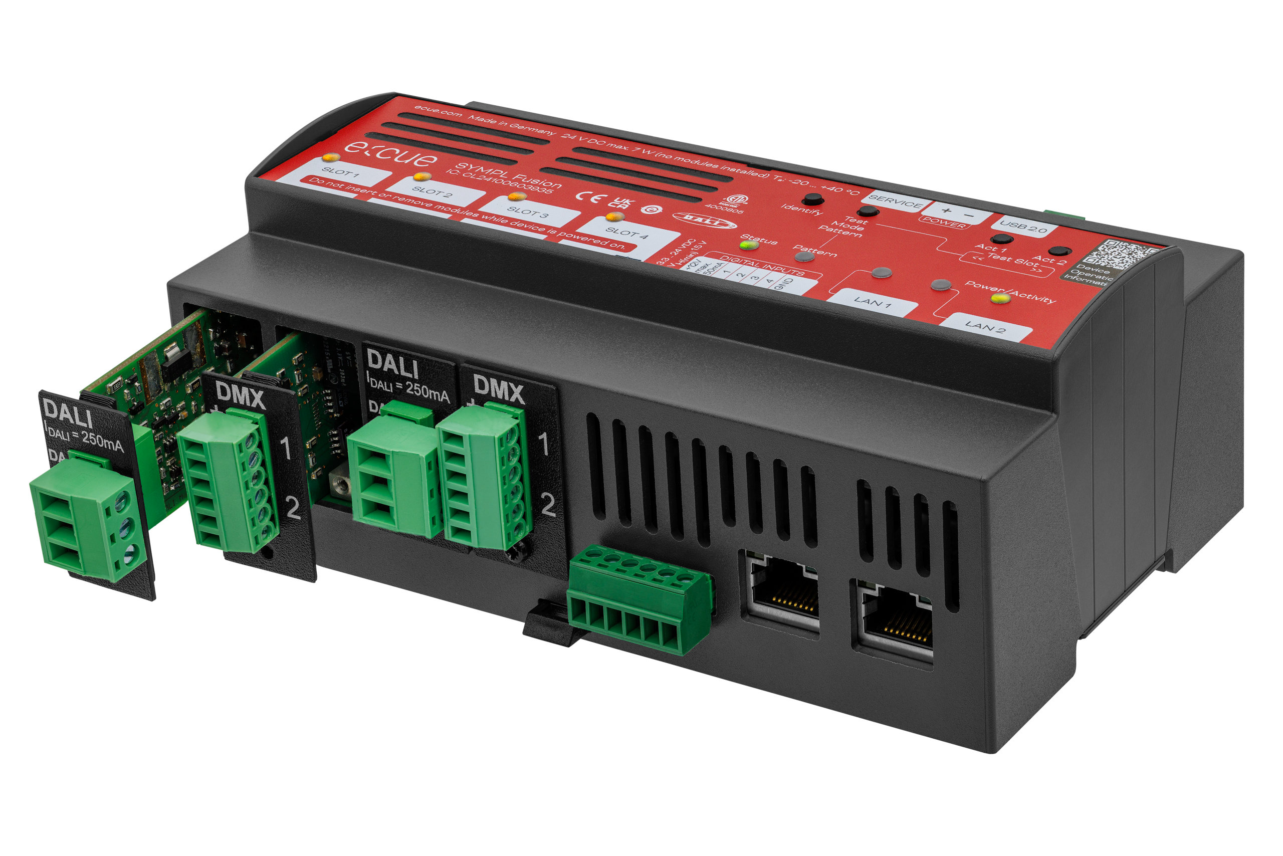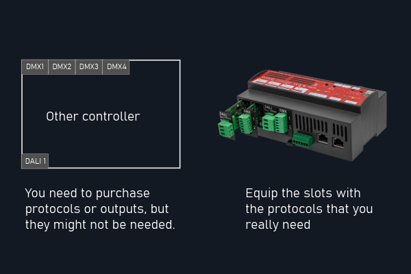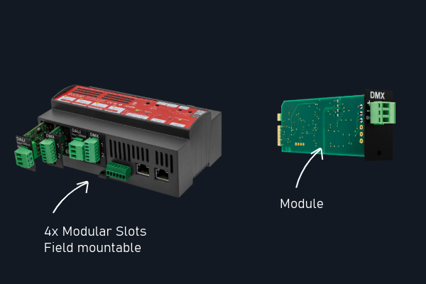 | Output Interfaces | 4 x Modular slot card, types: DMX512 / RDM Module DALI-2 Module 0 … 10 V / 1 … 10 V Module SPI Pixel Module Relay Module RS232 / RS485 Module |