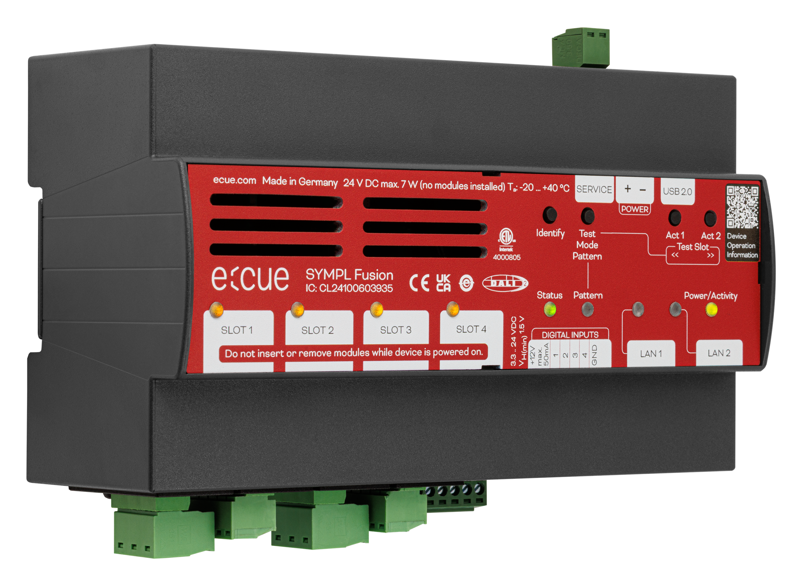 | User Interfaces | LEDs for Ethernet activity, device status, power; 2 x Freely assignable versatile buttons 2 x Buttons for direct test mode 1 x LED per slot card |