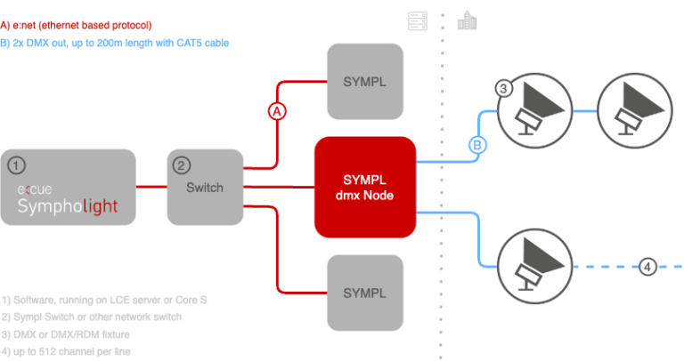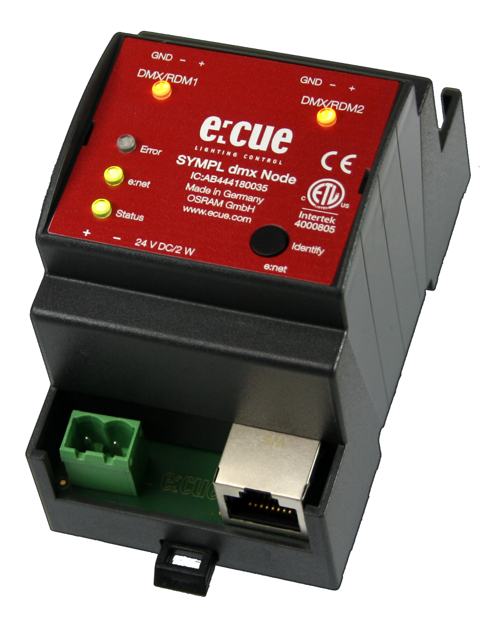 The SYMPL dmx Node is a two-channel DMX and RDM interface that can be used with e:cue’s lighting control software SYMPHOLIGHT. It provides two independent DMX/RDM universes for up to 1024 channels. The SYMPL dmx Node is supplied with voltage via an external adaptor or through Power-over-Ethernet (PoE). It is easily mounted onto standard 35 mm DIN rails or a suspension hole in the housing base, on walls, or on any other solid vertical surface. The SYMPL dmx Node is a straightforward, reliable, and easy-to-use interface solution for SYMPHOLIGHT.