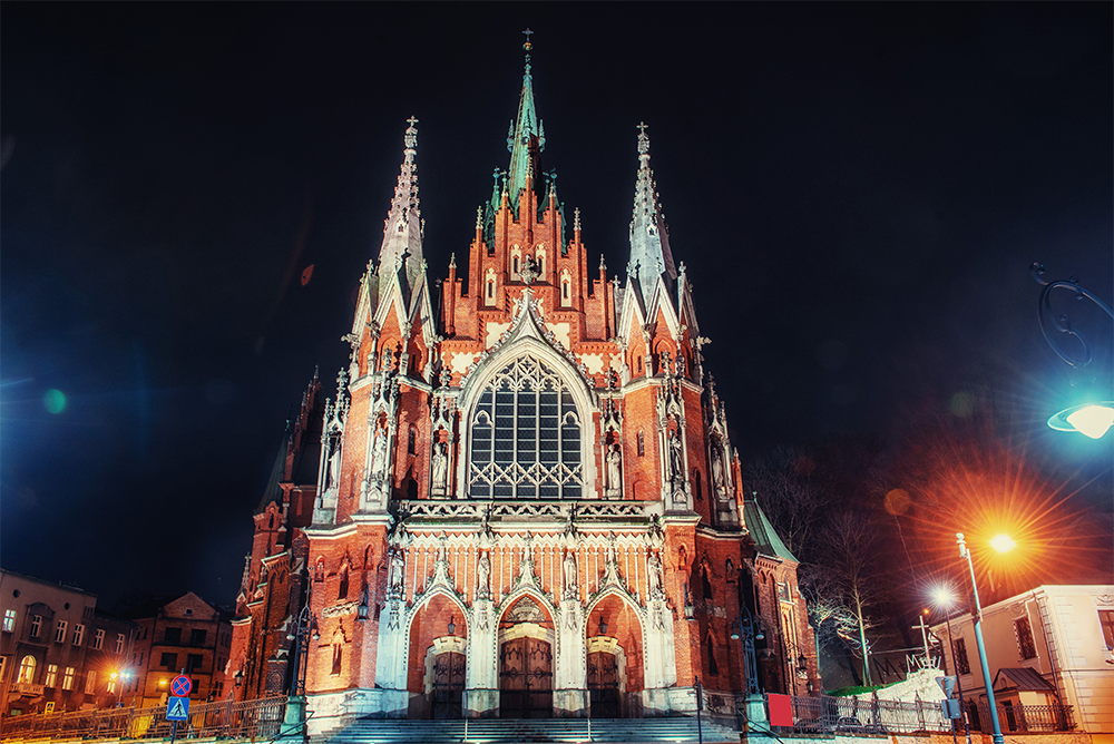 The church is well and evenly lit, but the red tones are this time are vibrant, the building has much more depth and multi dimensional. This is much more visually appealing with warm, rich tones .