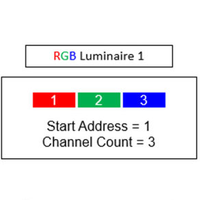 自动寻址灯具在为自己分配一个唯一的DMX 地址后,会从数据包中的DMX 级数据中删除所需的地址(见下文的通道要求示例),并将截断的数据包传递给DMX 网络中的下一个灯具。