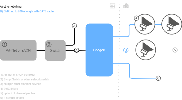 Bridge8 是一个 sACN/Art-Net 到DMX512 的接口,共有 8 个DMX512 输出,最大可连接 4096DMX512 通道。它可安装在DIN rail 上,是专为恶劣的室外环境而开发的。该产品专为户外恶劣环境设计,集成了浪涌保护装置和组件,可承受极高的工作温度 – 输出隔离电压高达 3.75 kV。内置的web interface 可以轻松设置和管理所有参数。通过可自由定义的DMX 值,可轻松将源 IP(sACN/Art-Net 发送器)更改为不同的设备。