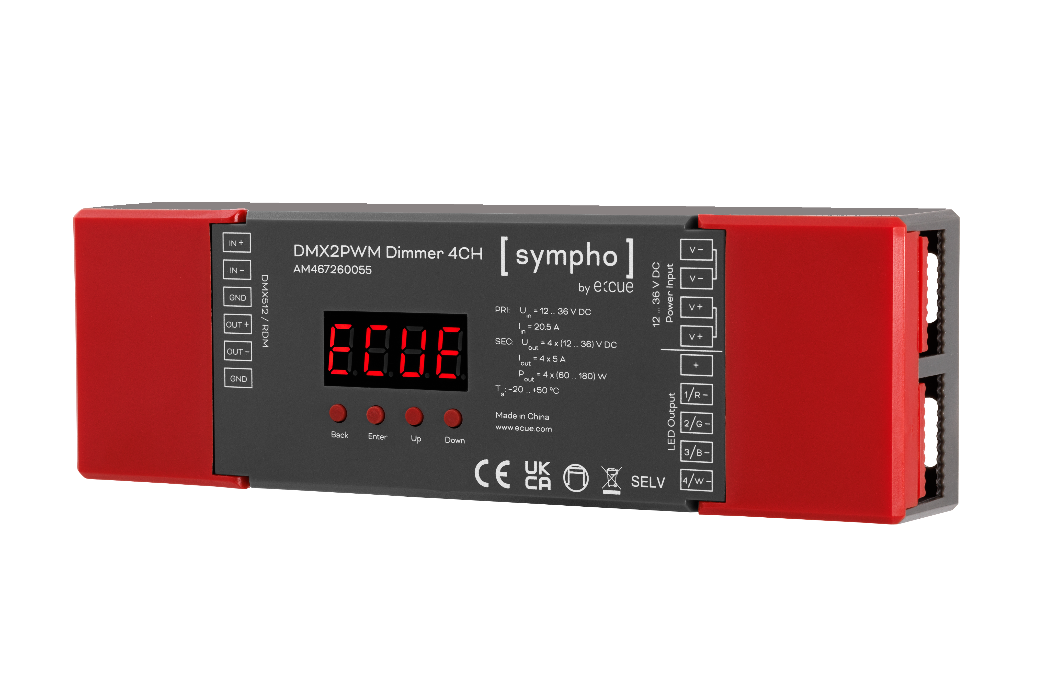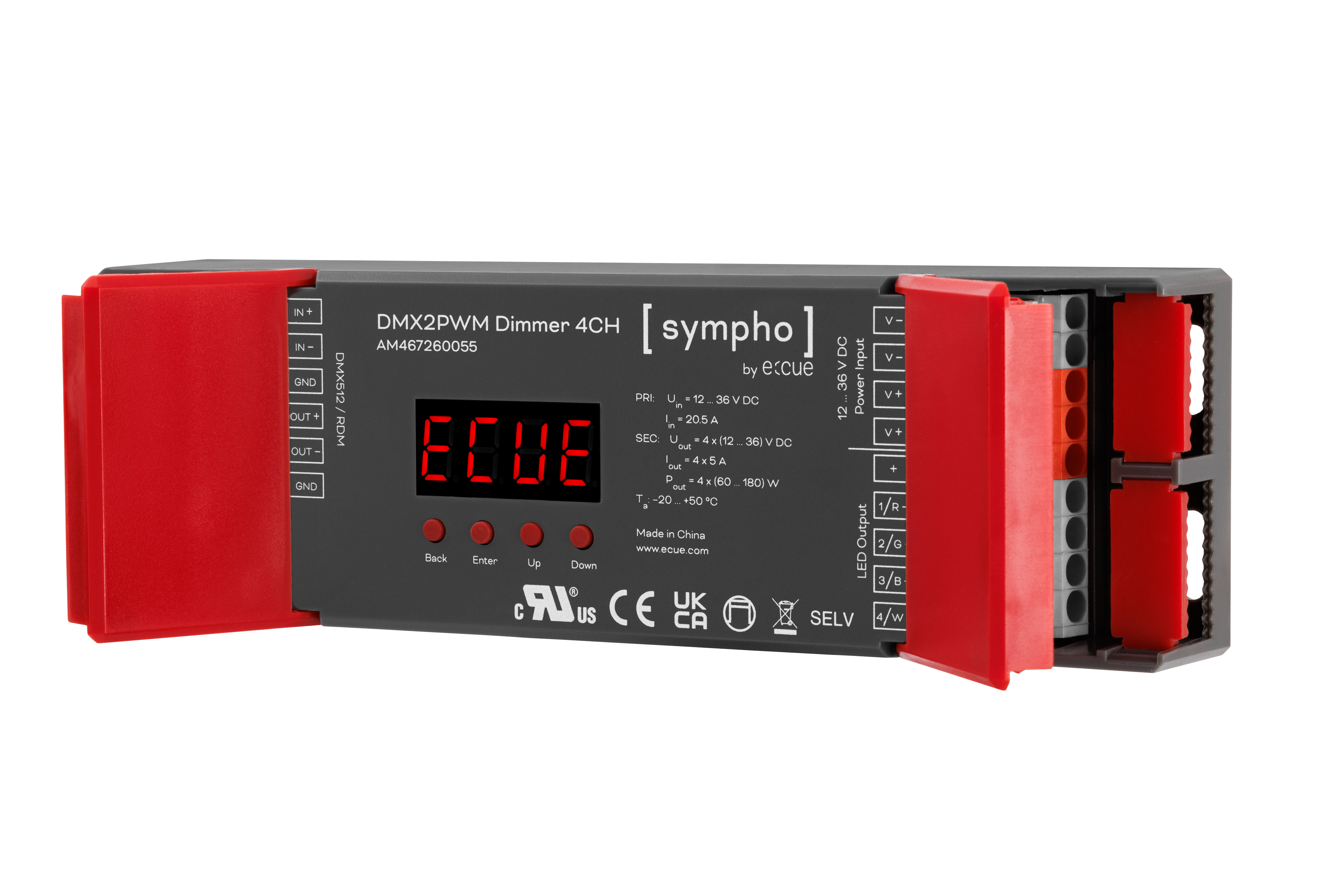 1 xDMX512 /RDM (3 针端子),用于连锁多个设备(最多 256 个),隔离,浪涌保护 4 x PWM 通道(5 针端子),用于恒压 |